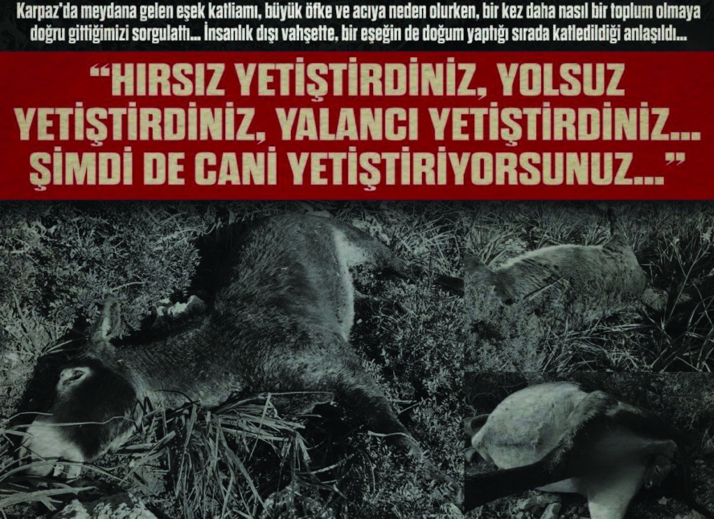 Yediden yetmişe herkes, eşeklerin katliamına tepki gös- terirken, katillere ise ciddi bir öfke yağdı. Karpazda yaşanan olayda tam on dört eşek katledilirken, eşeklerden birinin doğum yaptığı sırada katledilen bir anne olması, katillerin insanlıktan nasibini almamış olduğu yönünde yorumlandı. Hatta bazı tepkiler Karpaz bölge halkını ve belirli bir etnik köke- ni hedef almaktaydı… Oysa sorun katillerin kökeninde veya insanlığında değil de, katlettikleri canlılara yönelik bakış açılarında olabilir miydi? Yani soruyu şöyle sorarsak; “Bu katiller için, hayvanlar bizler gibi yaşam hakkı olan birer canlı mıydı; yoksa insanların maddi çıkar, arzu ve isteklerine göre yaşaması, kullanılması, alınıp satılması, ve hatta öldürülmesi kabul edilebilir olan birer mal mıydı?” Olaya bu şekilde yaklaştığımız anda, karşı karşıya olduğumuz sorun “Karpazlıların” ve Karpaz’ın ötesine geçmeye başlıyor. Öyle ki; Elyeli bir “orijinal Kıbrıslı” ile, Köşklüçiftlik’te oturan yedi kuşak Lefkoşalı’nın hayvanlara karşı yaklaşımının çok da farklı olmadığı, sokak hayvanları özelinde takındıkları tavırdan görü- lebiliyor. Belirli internet gazeteleri tarafından zaman zaman servis edilen ve hayvanların hedef gösterildiği haberlerin altına yapılan yorumlar incelendiğinde bu durum kolaylıkla anlaşılabiliyor. Cins köpeği için 80 bin TL para ödeyen bir insan, mahallesindeki sokak köpeğini alıp “uzak bir yere” bı- rakarak sorunu çözdüğünü sanıyor(!) ve anayol kenarlarına ya da ovalara atılan köpekler acı içinde can veriyor. Yani Karpaz’daki bir katil ekinlerini yediği için eşekleri vurmayı kendine hak görürken, Lefkoşa’daki bir katil evin önüne s.çtığı için bir köpeği öldürüyor. Sorun etnik kökenden ziyade, kapitalist sistemde barbarlaşan insanın doğa ve diğer canlılar ile kurduğu “faydacı” ve “maddi değer” odaklı ilişkisinde yatıyor. Hayvanların gerçek bir refaha kavuşması ve eziyetlerden kurtulabil- mesi için “başka bir sistem, başka bir dünya ve başka bir kültür” gerekiyor.