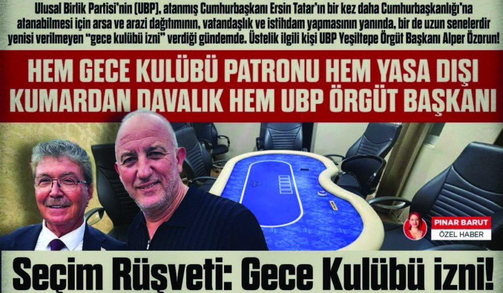 Yıllardır seçim rüşvetleri ve böyle dönemlerde dağıttığı menfaatlerle bilinen UBP bu kez sadece ev, arazi, ne arsa, ne de geçicilik dağıttı. Ulusal Birlik Partisi seçim rüşveti ve pezevenklik dağıtarak bir ilke imza attı. Hali hazırda gece kulübü bulunan UBP örgüt başkanına, seçim öncesinde yeni gece kulübü izni verilmesi UBP için önemli özel ve farklı bir icraat oldu. Bir yandan AKP’yle at pazarlığında olan adada okullarda çocuklara Kur’an öğreten UBP’nin, diğer yandan ülkeyi kumar ve fuhuşla cennete çevirmesi elbette çok büyük bir uyumsuzluk. Ancak seçim öncesinde pezevenklik dağıtılması, Ünal Üstel yönetiminin vizyonuna yaklaşan yenilikçi bir adım oldu.