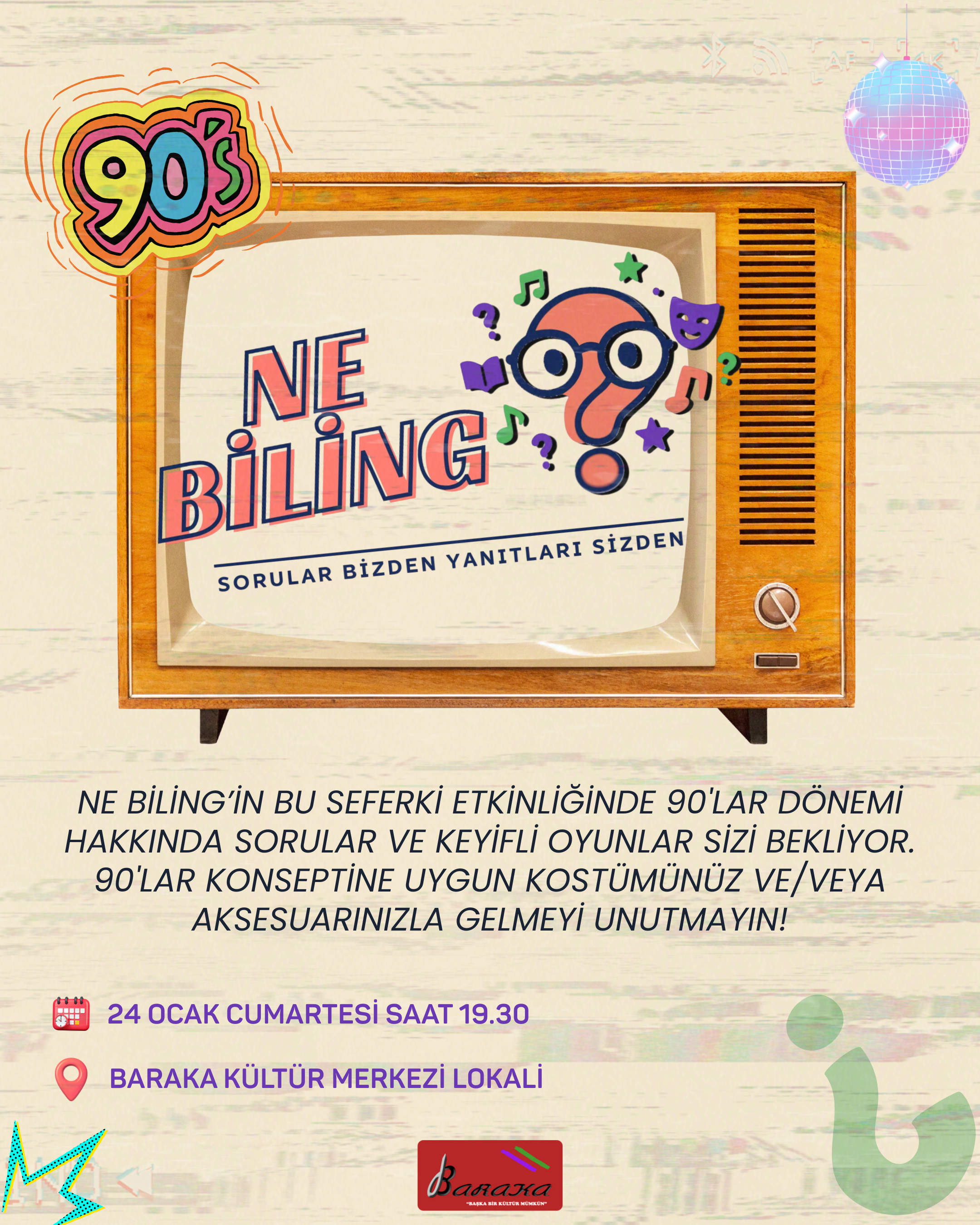 Derneğimizin yeni etkinliklerinden Ne Biling’de bu ay 90’lar dönemine zaman yolculuğu yapıyoruz. 90’lar çocuğu olun ya da olmayın, bu dönemler herkesin gönlünde taht kurmuştur; müzikleri, oyunları, kıyafetleri, filmleri-dizileri, toplumsal olayları, tarihe kazınan unutulmaz anları sanki dünmüş gibi aklımızda yer edinmiştir. Belki de edinmemiştir. İşte 90’lar sizin için ne ifade ediyor, bu dönem hakkında neler hatırlıyorsunuz diye kendinizi ölçmek ve eğlenmek istiyorsanız bu etkinliğimizi kaçırmayın.