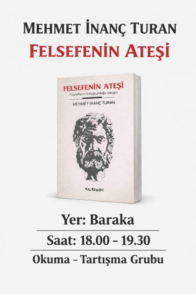 Baraka Okuma-Tartışma Grubu, her perşembe saat 18.00-19.30 arasında okumalarına devam ediyor. Mehmet İnanç Turan’ın kaleme aldığı “Felsefenin Ateşi” isimli yeni kitaba başlarken dileyen herkesi 12 Mart Perşembe’den itibaren her perşembe bu kitabı birlikte okumaya ve yangını izlemeye bekleriz.Felsefi düşünme yolu en azından iki bin beş yüz yıl önce başlamıştır. Dünyayı yorumlamak, bilgiye ulaşmak amacıyla filozoflar bir yangın başlatmıştır. Gerçeği bulma, anlama yangınıdır bu! Felsefi olmayan düşünceleri yakarak, onun küllerinden felsefi düşünceleri yaratma yangınıdır bu!Antikçağ filozofları felsefi yangını ilk başlatanlardır. Antikçağın bütün filozofları yangını tutuşturmaya katılmıştır. Ne var ki, bir kısmı yangını gerçeğin doğrultusunda körüklemiş, diğer kısmı gerçeğin aksi yönüne doğru görüşler taşımıştır. Antikçağ sonrası ”düşünme yangınına” katılan filozoflar açısından da durum farklı olmamıştır. Bu kitabın amacı, başlatılmış felsefi düşünme yangınının en önemli aşamalarında yer almış filozofların görüşlerini incelemeye yöneliktir. Herakleitos’tan Descartes’a uzanan köprü üzerinde felsefi düşünme yolunda yürümektir. Gerçeği aramak tükenmez bir süreçtir, yangın devam etmektedir. Gerçeğin peşinden koşmak isteyenler yangını izlemelidir. Çünkü “gerçek” yangının içindedir.