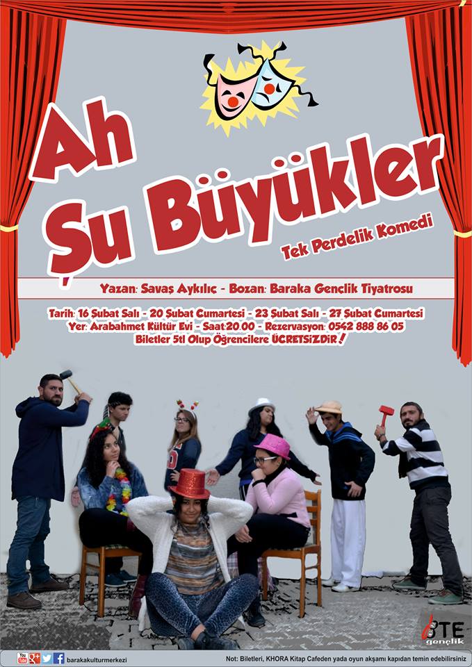 “Ah Şu Büyükler”, Baraka Tiyatro Ekibi’nin Gençlik Tiyatrosu’nun ikinci oyunu olarak 2016 Şubat ayında ve yoğun istek üzerine 3 Mart’ta Lefkoşa’da sahnenledi. Genellikle lise öğrencilerinden oluşan gençlere, Eylül ayından bu yana ses-nefes kullanımı, şan, vücut dili, ritim ve yaratıcı doğaçlama gibi konularda eğitimler verildi. Baraka Tiyatro Ekibi’nin on yılı aşkın deneyimini gençlerle paylaşmayı hedefleyerek geçen yıl oluşturduğu Gençlik Tiyatrosu, bu yıl ikinci kez sahne alarak Savaş Aykılıç’ın yazdığı, Turgut Özakman’ın “Ah Şu Gençler” adlı oyununa gönderme yapan “Ah Şu Büyükler” oyununu sahneleyerek gençlik sorunlarını yetişkinlerin değil, gençlerin gözünden bizlere anlattı. Oyun boyunca gençlerin aile içindeki komik ve trajikomik hikayeleri anlatılırken, hem ülkemiz gençliği hem de aileler ve eğitimciler kendi sorunlarına dair, kendilerinden bir şeyler bulacağı oyun 600’ü aşkın seyirciye sunuldu.