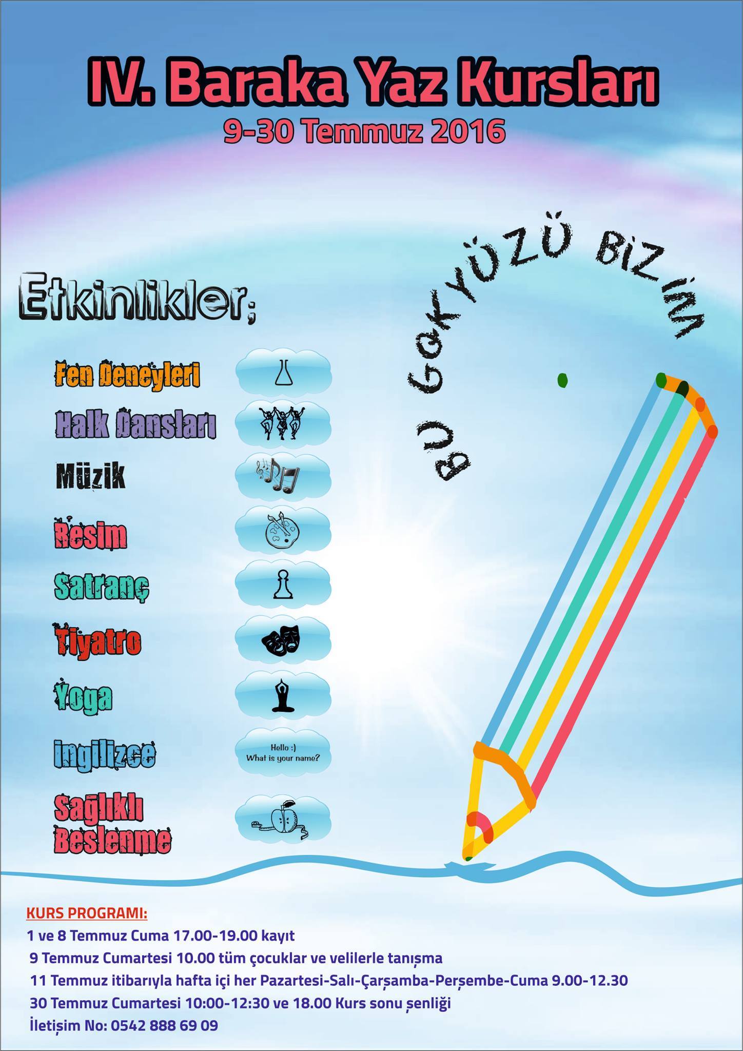 Bu yıl dördüncüsü yapılacak Baraka Yaz Kursları 9-30 Temmuz tarihleri arasında gerçekleştirilecek. “Okuyan insan halkının yanındadır” şiarından yola çıkılarak, Baraka Kültür Merkezi’nin çağrısıyla gönüllü eğitmen olmak isteyen kişilerce yapılacak kursların bu yılki teması ise “Bu Gökyüzü Bizim” olarak belirlendi. 7-11 yaş aralığında olan ilkokul çağındaki çocuklar için yapılacak kursta; resim, müzik, tiyatro, fen deneyleri, sağlıklı beslenme, satranç, yoga, İngilizce, halk dansları alanında etkinlikler yer alacak.